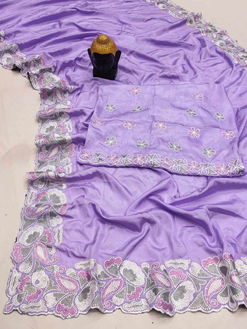Pure D Natural Soft Satin saree with heavy Embroidery thread and heavy siroski work and cutwork borders