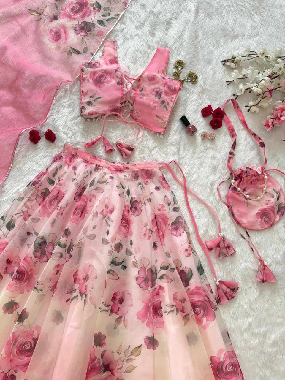 Lehenga – Pure organza silk digital printed lehenga with a grand 8-meter flair. Finished with canvas patta for a perfect flare
